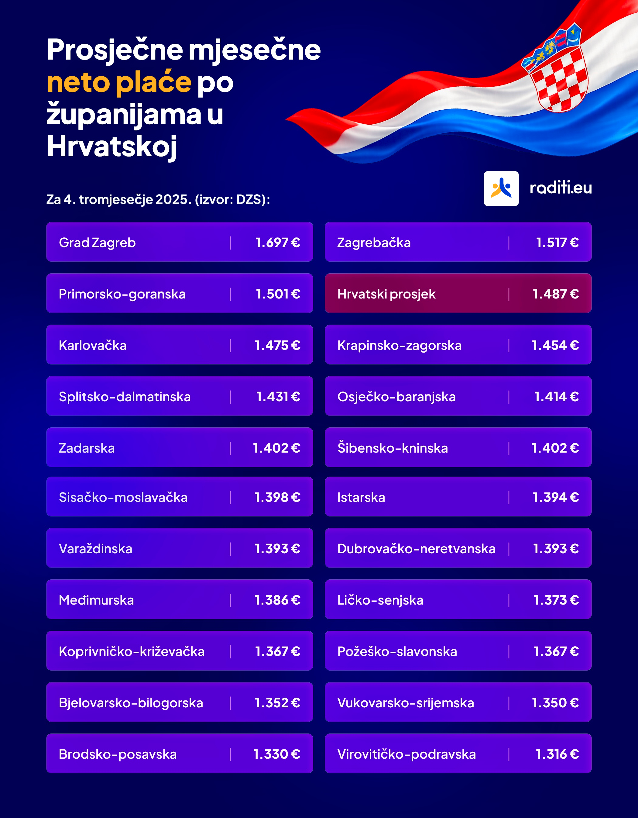 Prosječna mjesečna isplaćena neto plaća na razini cijele Republike Hrvatske u posljednja tri mjeseca 2025. godine iznosila je 1.487 eura. Analiza pokazuje da samo tri administrativne cjeline uspijevaju nadmašiti taj nacionalni prosjek. Uvjerljivo najviša primanja imaju zaposleni u Gradu Zagrebu, gdje je prosječna neto plaća dosegnula iznos od 1.697 eura. Slijedi Zagrebačka županija s prosjekom od 1.517 eura te Primorsko goranska županija u kojoj prosječna isplaćena neto plaća iznosi 1.501 euro. Sve ostale hrvatske regije bilježe primanja ispod državnog prosjeka, što jasno ukazuje na snažnu centralizaciju ekonomske moći.