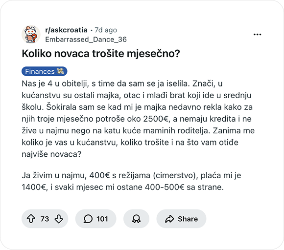Čini se kako su nekadašnje prosječne plaće danas jedva dovoljne za pokrivanje osnovnih životnih troškova, a pojam štednje polako prelazi u sferu nedostižnog luksuza. Upravo se o ovoj bolnoj problematici nedavno povela žustra rasprava na popularnoj društvenoj mreži Reddit, gdje su korisnici potpuno iskreno i anonimno podijelili svoje mjesečne izdatke.